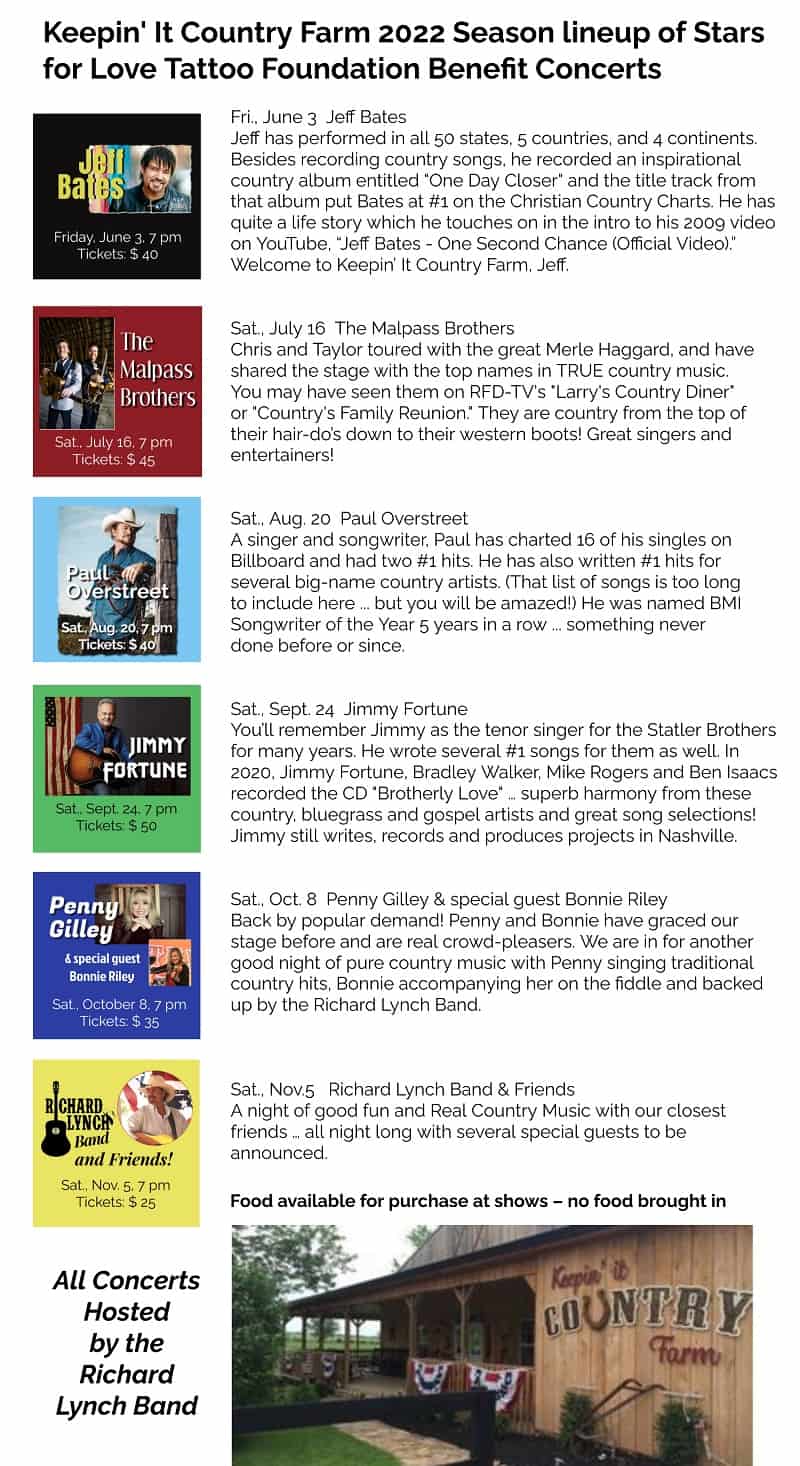 Richard Lynch has announced this year’s Love Tattoo Foundation benefit events at his Keepin’ It Country Farm, including #1 Billboard artists and RFD TV stars.